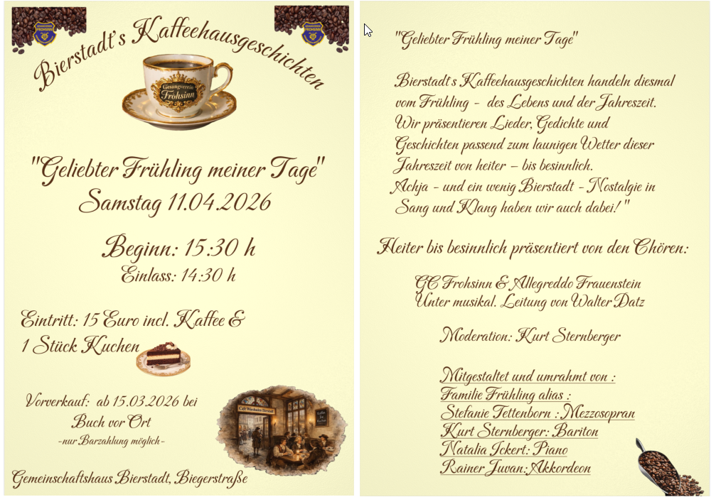 Am Samstag dem 11. April 2026 lädt der Gesangverein Frohsinn wieder zu Bierstadts Kaffeehausgeschichten ein. Vor Programmbeginn, beim Eintreffen bieten wir Kaffee und ein Stück Kuchen an. Es besteht freie Platzwahl, das Platzangebot beträgt 130 Sitzplätze.